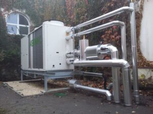 Az épület energetikai korszerűsítése keretében az elavult talajszondás hőszivattyúk leváltásra kerültek nagyhatásfokú berendezésekre, valamint a mértékadó időszakokban hiányzó hőteljesítmény fedezésére az udvarban elhelyezésre került levegő-víz hőszivattyú is. A hőközpont hidraulikai és szabályozástechnikai átalakítása mellett napelemek is telepítésre kerültek.