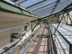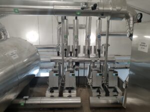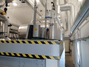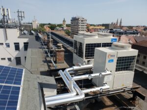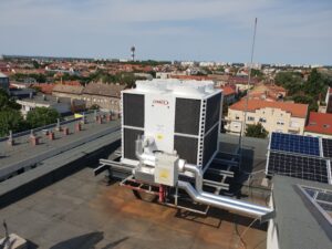 A Kormányhivatali épületben lévő irodák 2/3-át ellátó központi hűtési rendszer hidraulikai átalakítása és korszerűsítése, központi szivattyú gépház kialakítása, valamint elavult folyadékhűtő berendezések helyére új korszerű energiatakarékos berendezés került beépítésre.