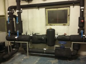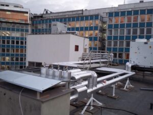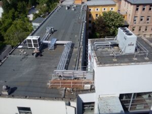 Az irodaépület hűtési energiaellátás teljesítményének és üzembiztonságának növelése érdekében központi hűtőgépházat létesítettünk, így egyesítve az eddig 3 független hűtési rendszert. Folyadékhűtő csere mellett a földszinten is kiépítésre került fan-coil hőleadó hálózat.
